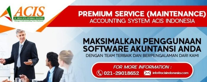 • Premium Service (Maintenance) Accounting System ini adalah produk jasa dari ACIS Indonesia untuk mengakomodir kebutuhan para pengguna sistem akuntansi seperti ACCURATE ataupun EASY Accounting yang memerlukan training, pengontrolan, monitoring dan support yang lebih premium dari implementasi/training harian biasa, dalam suatu periode kontrak (Minimal 1 Tahun).